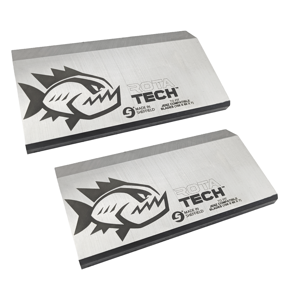 Satz präzisionsgefertigter Hacker-Messer für Jenz HEM 28, Abmessungen 108 × 60 × 7 mm.